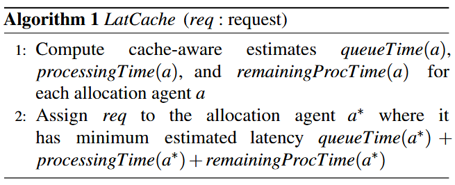 我们现在描述 LatCache,这是我们为该代理分配任务提出的算法。由于其以延迟为驱动,做出决策的主要组成部分是对传入请求如果被分配给某个 AA 时将产生的延迟进行仔细估计。