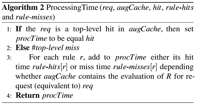 给定此缓存结构,算法 2 描述了我们对某个请求 req 在指定 AA 上处理时间的估计。该过程接收的输入包括 AA 的“增强缓存状态” augCache(如 §4.2.2 所定义)、用于顶层缓存命中处理时间的估计值 estimate hit,以及包含每条规则的规则命中和规则未命中时间估计的向量 rule-hits 和 rule-misses。这些输入估计可以例如通过历史数据计算,详见 §5。如果请求在 augCache 中顶层命中,其估计延迟仅为 hit。在顶层未命中的情况下,我们会基于 augCache 底层存在的规则考虑“部分命中”。
