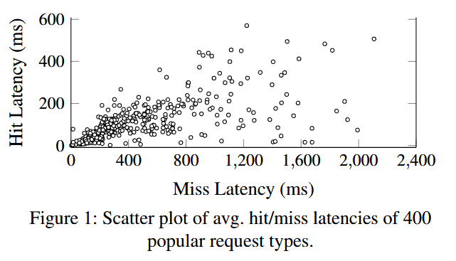 与传统数据缓存系统不同,虚拟机分配查询中缓存命中与未命中的延迟会随不同请求类型的复杂度呈现显著差异。图1展示了单个分配器节点观测到的命中/未命中延迟分布(此处的命中与未命中均指缓存顶层)。某些请求类型的缓存命中延迟甚至高于其他请求的未命中延迟,这与"命中必然快于未命中"的传统假设相悖。这种波动性主要源于两个原因: