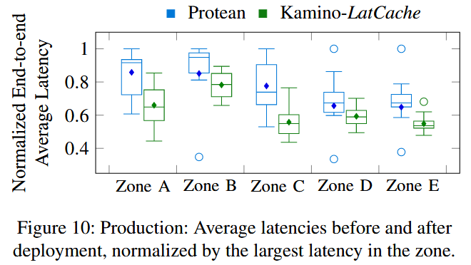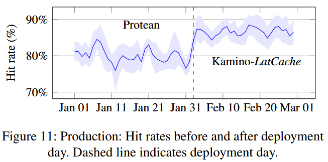 为了展示 Kamino-LatCache 对缓存命中率的影响,我们将五个区域的测量结果进行汇总,并在图 11 中绘制了两个月的命中率曲线;虚线(2 月初)标示了 Kamino-LatCache 取代 Protean 的时间点。总体来看,五个区域的平均缓存命中率从 80% 提升至 86.6%,因此总缓存未命中量减少了 33%。模拟与生产系统中缓存命中率提升差异的两个主要原因是:(a) 整个系统中缓存大小存在差异;(b) 生产环境中 15 天的动态工作负载变化,与 24 小时的模拟追踪数据相比。
