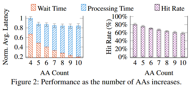 据我们所知,当前最先进系统均未采用跨AA共享缓存方案。例如Protean将缓存内存划分为槽位并分区分配给各AA以实现最大并发度,但减少单AA缓存槽数量以增加AA实例数会导致缓存未命中率上升和请求扩展能力下降(参见§2.2节)。