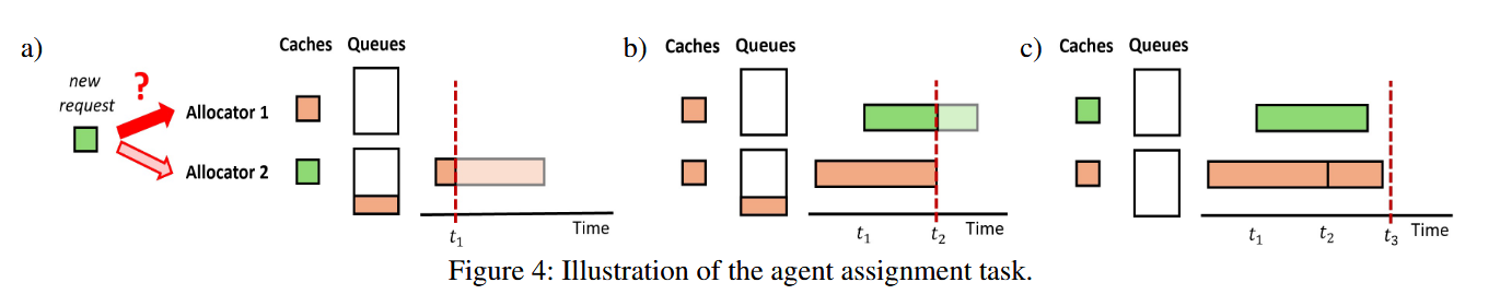 图 4 给出了代理分配任务的示例。在这个例子中,有两个 AA,每个都有一个简化的单槽缓存,以及两种请求类型(绿色和橙色)。左图显示了在时间点 t1 时 AAs 的缓存、队列以及 AA 2 的当前执行状态,此时一个新请求到达,它需要被分配给某个 AA;在这种情况下,它被分配给 AA 1。中图显示了在时间点 t2 的状态,此时 AA 2 完成了它的第一个请求,并将开始处理队列中的请求;在这个例子中,AA 2 的缓存已在第一个请求完成后更新。右图显示了在更晚的时间点 t3 的状态。需要注意的是,AA 2 的第二个请求处理时间更短,因为在它开始处理时(时间 t2),其类型已存在于缓存中。同时还要注意,AA 1 的缓存由于完成了绿色请求而得到了更新。