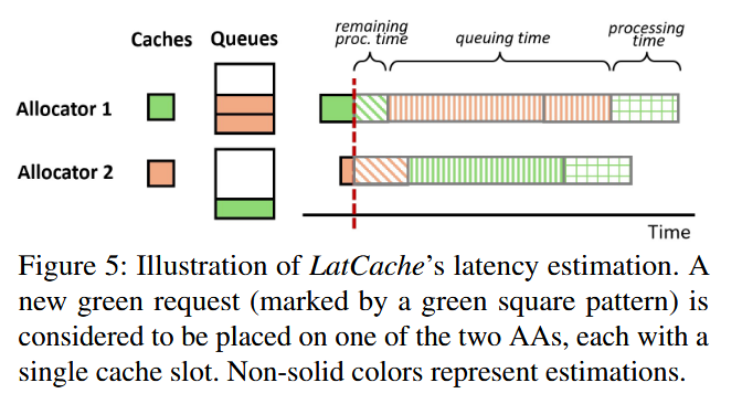 Fig.5 LatCache 延迟估计示意图。一个新的绿色请求(用绿色方格标记)被考虑分配到两个 AA 中的一个,每个 AA 只有一个缓存槽。非实心颜色表示估计值。
