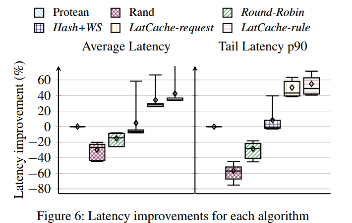 图 6 展示了不同算法相比基线 Protean 在平均延迟和第 90 百分位尾部延迟上的百分比改进情况。标准负载均衡算法 Random 和 Round-Robin 的平均性能比基线差约 20%。缓存感知的 Hash+WS 算法,通过促进请求的共同定位加上简单负载均衡,平均延迟仅提高 4.4%,且方差较高,而尾部延迟提高 9.1%。相比之下,我们的 LatCache-request 和 LatCache-rule 算法在平均延迟和尾部延迟上相较于其他所有算法均有显著提升,相比基线 Protean 尾部延迟提高超过 50%。