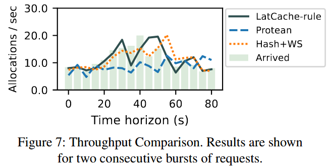 虽然请求分配延迟是我们的主要指标,但我们的算法在吞吐量方面也表现出优势,尽管不如延迟改善那么显著。然而,在请求突发期间,我们始终观察到相比 Protean 吞吐量提升约 2 倍。图 7 绘制了在请求突发窗口中各算法的吞吐量曲线(为清晰起见,Random、Round-Robin 和 LatCache-request 被省略)。
