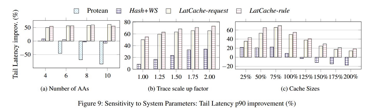 对缓存大小的敏感性:我们评估了算法在 AA 缓存系统内存大小变化下的性能。图 9c 显示了每种缓存大小下相较于 Protean 的尾部延迟改进,其中 100% 代表前述实验中使用的缓存大小。首先,即使在较小的缓存下,缓存友好的算法如 Hash+WS、LatCache-request 和 LatCache-rule 仍优于无缓存感知的 Protean。此外,LatCache 算法即使在有限缓存内存下,也持续优于 Protean 和 Hash+WS。其次,对于较大的预留缓存,LatCache-request 和 LatCache-rule 仍然优于 Protean 和 Hash+WS,尽管性能提升较为有限。随着缓存增大能够容纳更多对象,数据局部性的重要性降低,因此性能提升幅度减小。
