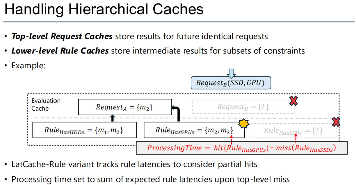 分层缓存的优势。为加速分配过程并降低计算成本,最先进的集群管理系统普遍采用缓存技术[16, 36, 41, 43]。其缓存设计的核心依据是:时间相近的提交请求在约束条件层面呈现局部性特征。以Protean为代表的现代虚拟机分配器使用缓存槽(逻辑缓存条目)来最小化重复计算。