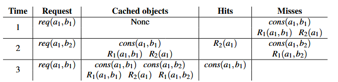表1:采用R1、R2双规则系统的分层缓存机制示例(其中R2规则仅依赖请求的a属性)。每个请求包含a、b两个属性,cons(·) 函数表示给定请求对应的整合节点列表。当新请求到达时,若其整合节点列表及R1、R2规则的评估结果未存在于缓存中,系统会将其载入缓存。