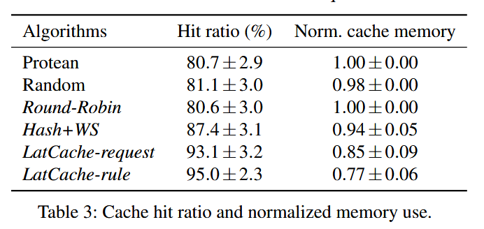 表 3 显示了各算法使用的平均缓存内存大小,并相对于基线 Protean 进行了归一化。所有无缓存感知算法(Protean、Random 和 Round-Robin)的内存占用非常相似。相比之下,缓存友好的 Hash+WS 内存使用有所降低(为 Protean 的 94%),而我们的缓存感知算法 LatCache-request 和 LatCache-rule 的内存使用明显更低(分别为 Protean 的 85% 和 77%)。这种减少归因于 LatCache 算法,它通过在 AA 上将相似请求共同定位,提高缓存命中率并促进缓存规则对象的更好复用。值得注意的是,LatCache-rule 通过在规则级别促进此类共同定位,并利用底层缓存中对象的信息,实现了最小的内存使用量。总体而言,LatCache 的内存开销可以忽略不计:缓存状态在运行时被探查,命中/未命中延迟已经被用于监控。内存使用的减少有效地允许在同一节点上增加 AA 的数量,因为每个 AA 所需的缓存量减少,从而存储必要的对象,这在我们的生产系统中尤为重要(参见 §2.2.3)。
