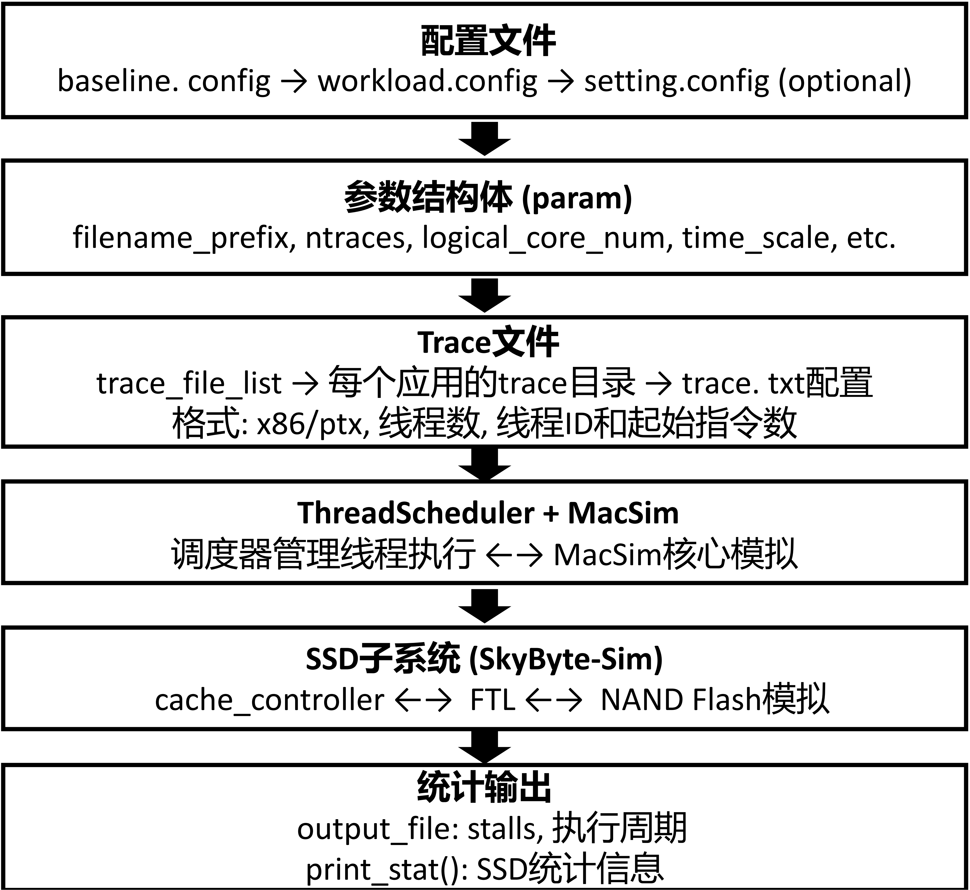 SkyByte 是一个基于 MacSim (一个cycle-accurate的CPU/GPU模拟器) 扩展的 CXL-based SSD 模拟框架。它结合了: